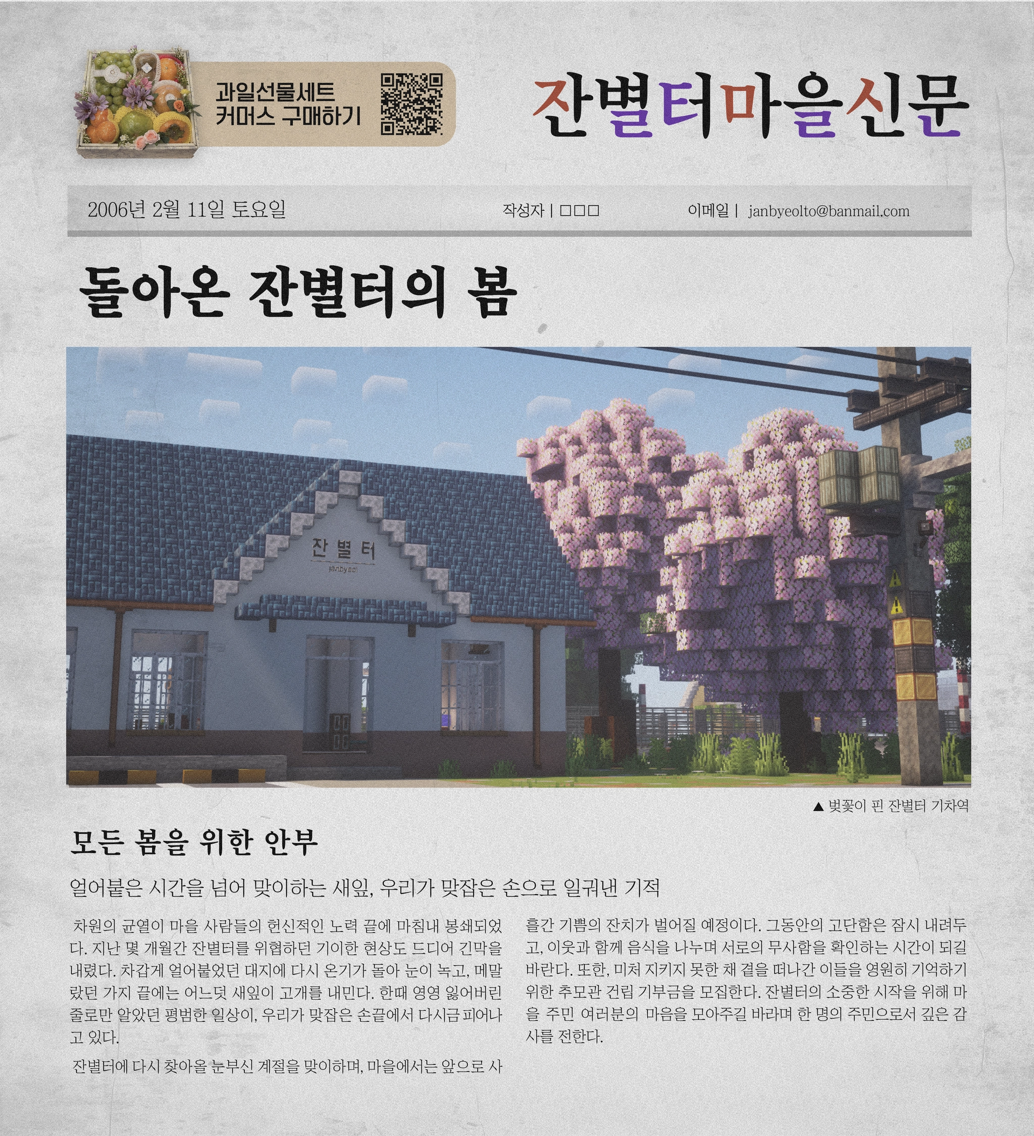 잔별터에 다시 찾아올 눈부신 계절을 맞이하며, 마을에서는 앞으로 사흘간 기쁨의 잔치가 벌어질 예정이다. 그동안의 고단함은 잠시 내려두고, 이웃과 함께 음식을 나누며 서로의 무사함을 확인하는 시간이 되길 바란다. 또한, 미처 지키지 못한 채 곁을 떠나간 이들을 영원히 기억하기 위한 추모관 건립 기부금을 모집한다. 잔별터의 소중한 시작을 위해 마을 주민 여러분의 마음을 모아주길 바라며 한 명의 주민으로서 깊은 감사를 전한다.
